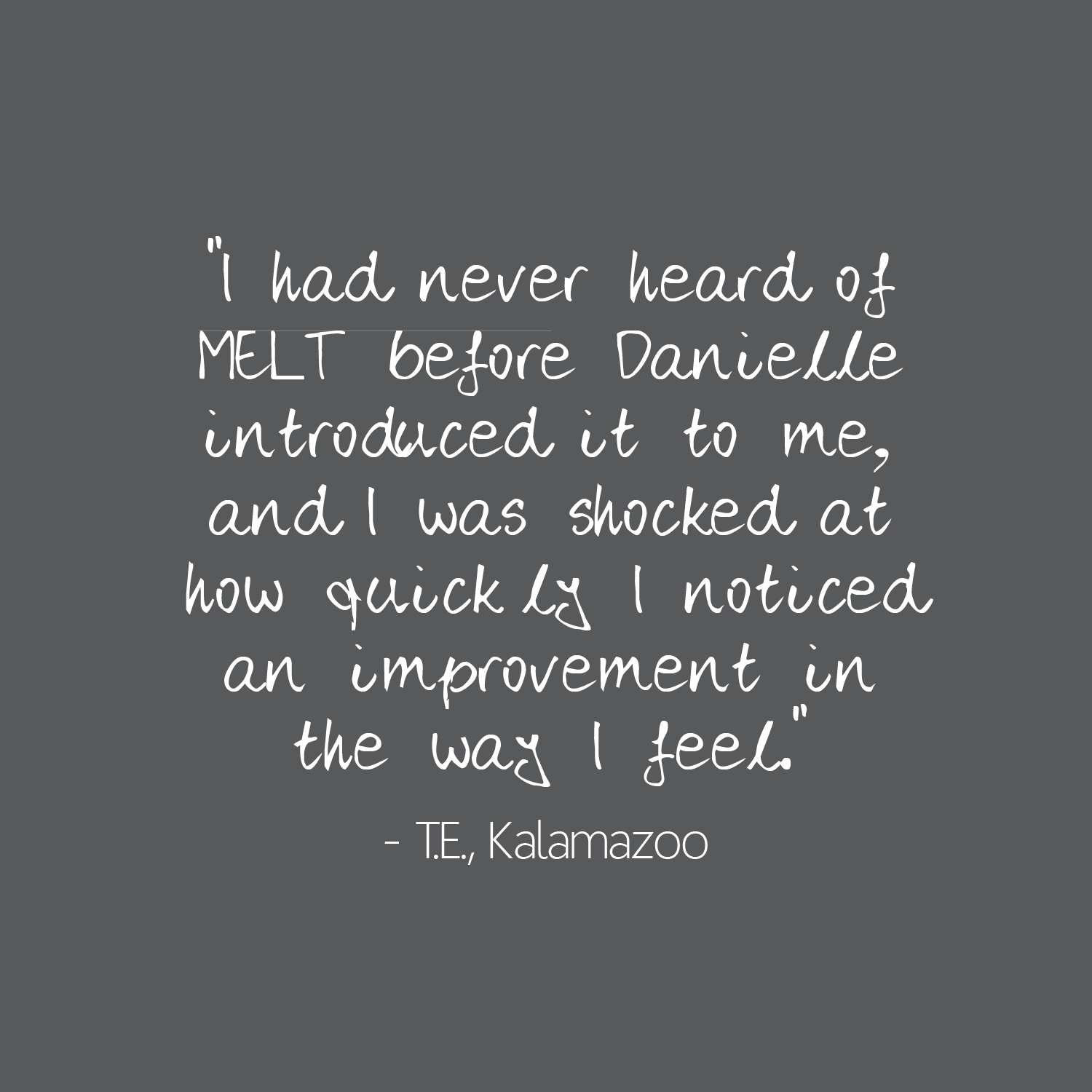 "I carry my MELT balls everywhere with me and do my hands and feet at work and use my roller religiously. I honestly don’t know where I’d be without MELT it’s just awesome! I have tried to become a runner at many points in my life, but pain in my knees always stopped me a few weeks into it. Danielle showed me a few techniques that have literally changed my life! I’ve been running for a few months now and the pain has never returned!"